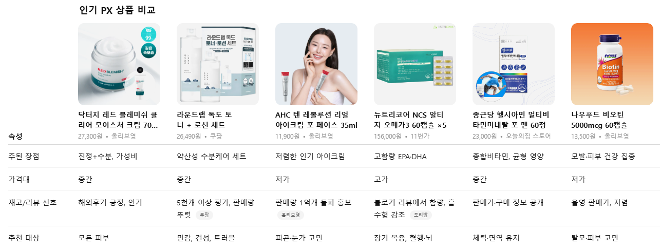 PX에서 실제로 잘 팔리는, 가성비와 실용성을 동시에 잡은 인기상품들을 한눈에 정리합니다. 화장품·스킨케어, 영양제·건강보충, 생활용품·패션까지 6종을 엄선했고, 각 상품의 가격, 장점, 실제 구매·리뷰 신호를 함께 제시해 바로 선택할 수 있게 구성했습니다.