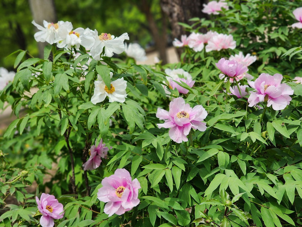 형태적으로는 줄기가 목질화되어 있으며, 잎은 깊게 갈라진 우상복엽 형태를 띠고 짙은 녹색을 보입니다. 꽃은 보통 4월 말에서 5월 사이에 개화하며, 한 송이의 크기가 매우 커 시각적 임팩트가 강합니다. 색상은 흰색, 연분홍, 진분홍, 자주색, 적색 등 다양하며 겹꽃 품종이 많아 풍성한 인상을 줍니다.