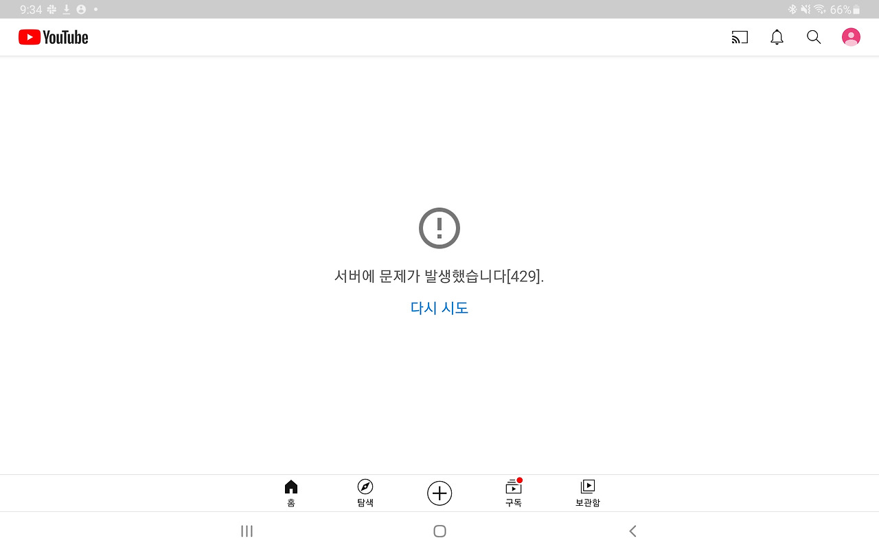 개별 기기 문제보다는 유튜브 서비스 인프라 일부 쪽의 오류 가능성이 높습니다.