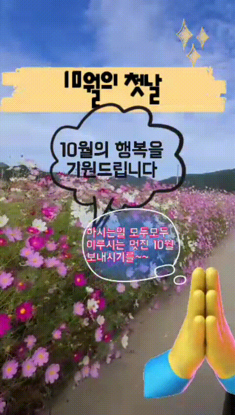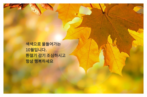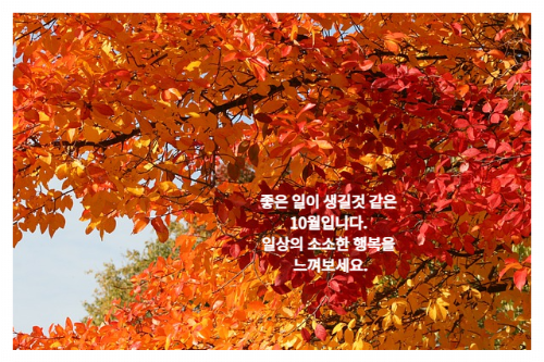 내일이면 10월입니다. 10월 첫날 인사가 중요하죠. 글만 적어서 보내도 되겠지만, 요새 카카오톡이 업데이트 되면서 프사 사진도 중요해졌죠. SNS에 10월 인사말 이미지를 띄워 놓으면 일일이 인사를 하지 않아도 10월 인사말을 건낸 효과를 보실 수 있습니다. 그래서 10월 인사말 이미지 모음을 준비 해봤습니다.