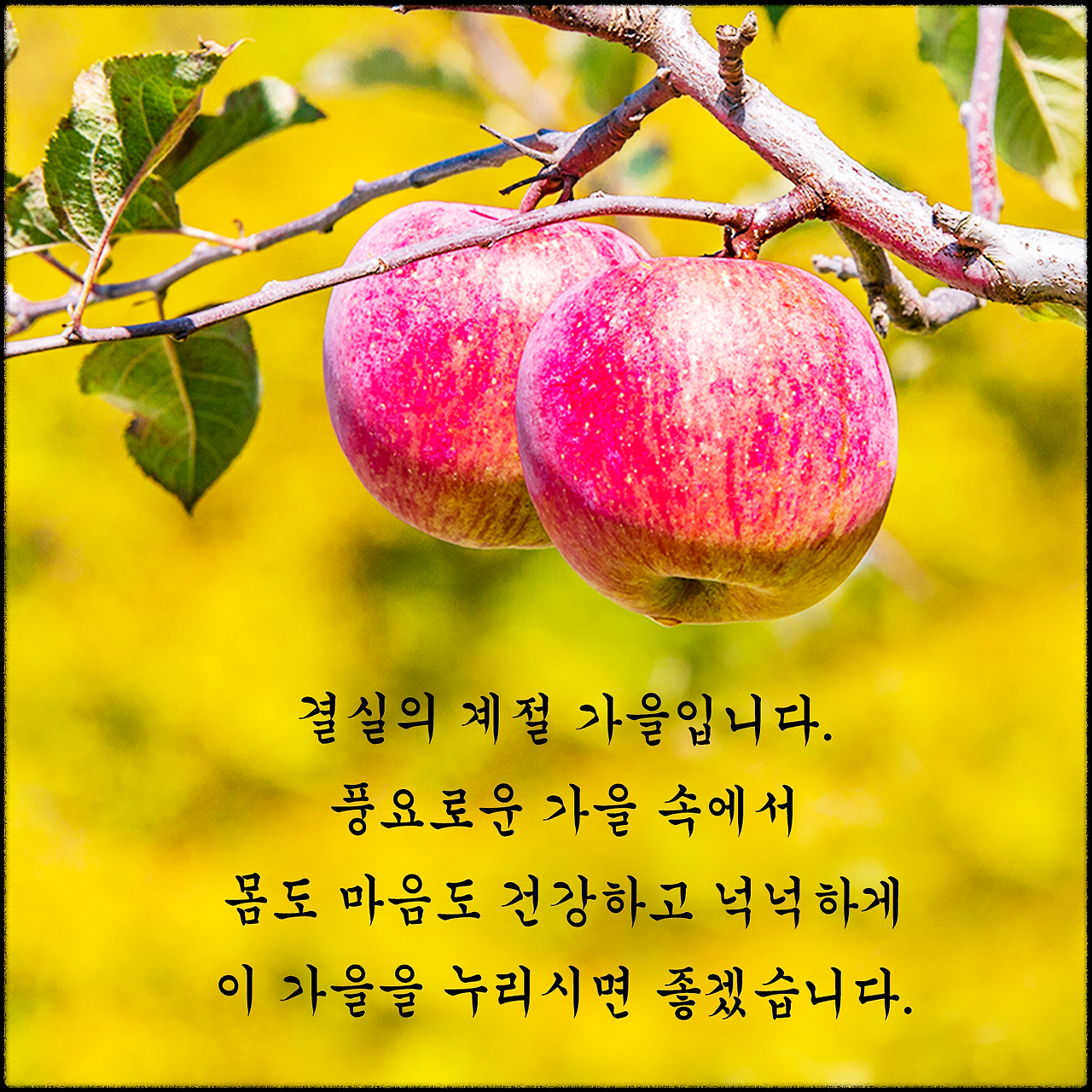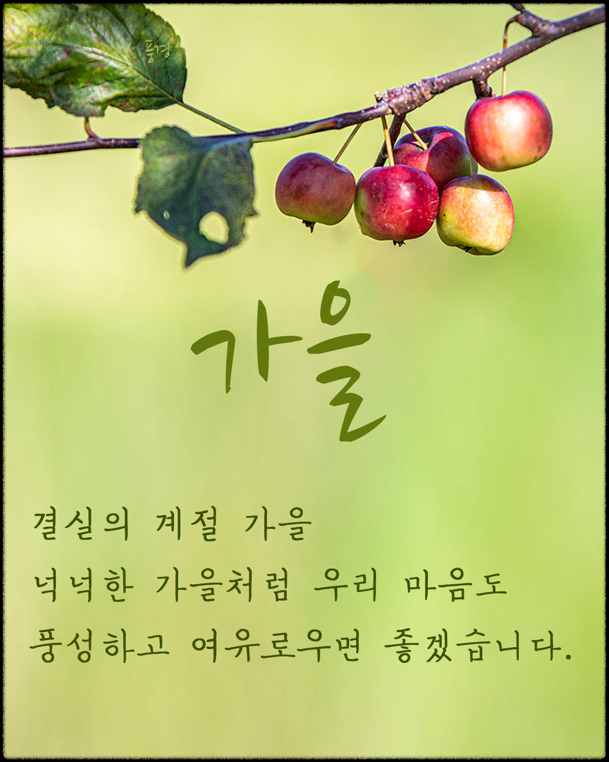 짧고 간결하며 스크롤 속에서도 눈에 띄어야 합니다. 계절감 키워드(청명, 단풍, 선선함)와 긍정 키워드(따뜻함, 평안, 풍성)를 함께 배치하세요.